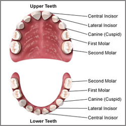 Babies are born with primary or baby teeth hidden beneath the gum surface and do not appear on the surface until several months. Normally between the ages of 6 to 10 months, babys first teeth begin to break out from the gums. Usually these are the two bottom central incisors, i.e. the two lower front teeth. After that, the four front teeth emerge. Next all the other teeth slowly begin to fill in, usually in pairs, on each side of the upper and lower jaw, until all the 20 teeth is filled in. These 20 teeth are equally divided between lower and upper jaw, i.e. 10 teeth for each jaw), and they come in by the time the child is around 3 years old. Mainly, this growth starts with the central incisor followed by lateral incisor, then canine teeth and lastly first and second molar filled in. The complete set of primary teeth remains until around 6 to 7 years of age. After this, another major change takes place with the arrival of permanent teeth, preceded by the falling of baby teeth. We believe that normally around the age of 6 first permanent or adult teeth begin to appear. They start with the first molars and lower front teeth. These are very important teeth and also the whole procedure helps to give a proper shape to the lower part of your childs face. Also, it affects the position of your childs other permanent teeth. Thus, your childs baby teeth will start to fall soon. Around the age of 12, the full set of permanent teeth replaces the baby teeth. The growth of teeth usually follows a distinctive pattern where central incisor and lateral incisor are first to fill in followed by first premolar, second premolar, first molar, second molar and lastly the third molar also known as wisdom teeth. Wisdom teeth or the third molar usually appear between the ages of 17 to 21 years, but in some cases these it can appear some years later than that too. Also, vary often wisdom teeth become impacted and extraction is required. SOME TOOTH ERUPTION FACTS