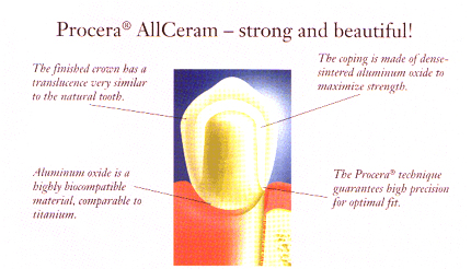 The most biologically compatible crowns are All Porcelain crowns such as Procera crowns. Research shows that these crowns have minimal allery problem as they are 99% biologically compatible. Procera - All Ceramic Crowns We at recommend new machined / hand-laid porcelain technology for anterior teeth. It is metal-free crown technique and it is strong enough to be universally recommend for the substitute of crowns or very large silver fillings for posterior teeth. "Procera", new system gives the strength of the traditional gold / porcelain crown along with the magnificence and translucency of porcelain. For the front teeth it provides superior esthetics along with the adequate biting strength. We at now have the solution - PROCERA All Ceram which is a coping made of extremely dense sintered aluminum oxide. The coping ensures great fit, optimal strength, and has the ability to transmit light without being transparent. It gives natural appearance to the tooth. Due to the strength in the core material, Since PROCERA AllCeram has good strength in the core material it is suggested for prosthetic reconstructions anywhere in the mouth.