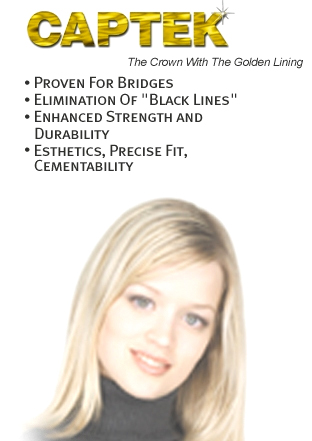 When teeth are in need of cosmetic improvement or repair, CAPTEK Crowns are the material today of choice. A Captek (capillary technology) Crown is made out of a high purity gold, platinum group metals and silver. They are strong, durable, resistant and healthy. Captek Crowns match your natural tooth color and with the use advanced gold material they help to reduce the bacteria in your gums. They are a good option if you want to have a healthy and attractive smile. No Unsightly "Black Lines" CAPTEK'S patented material enables us to provide you with a crown that will look natural at the gum line, eliminating any unsightly gray or black lines commonly associated with traditional crowns. The light dispersion effects of CAPTEK crowns are perfect for achieving vital, attractive tooth color. These crowns mimic best natural tooth structure, better than any other crown or veneer material. CAPTEK is the ideal material for matching natural tooth color following ZOOM, for any tooth shape(cosmetic) changes which may be desired. CAPTEK crowns are designed for the patient who demands the best appearance!!